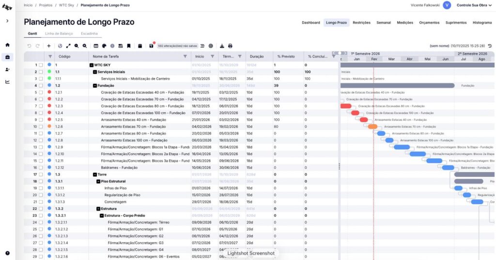 A integração entre cronograma, controle semanal e gestão de restrições transforma o planejamento em instrumento ativo de gestão, e não apenas documento de referência.